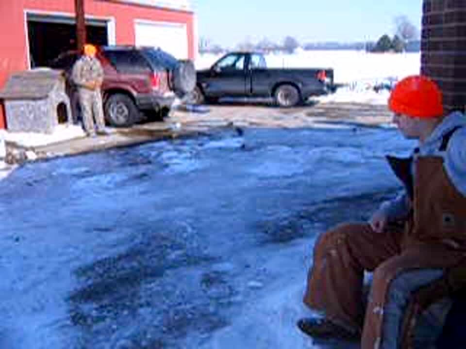 Snow Fall. Man on flying saucer flips over while going down snow bank. (inner tube)