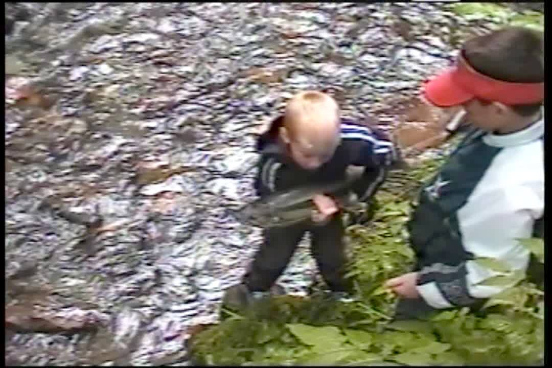 A boy tot tries fishing and falls into a lake. Action starts at 00:18.