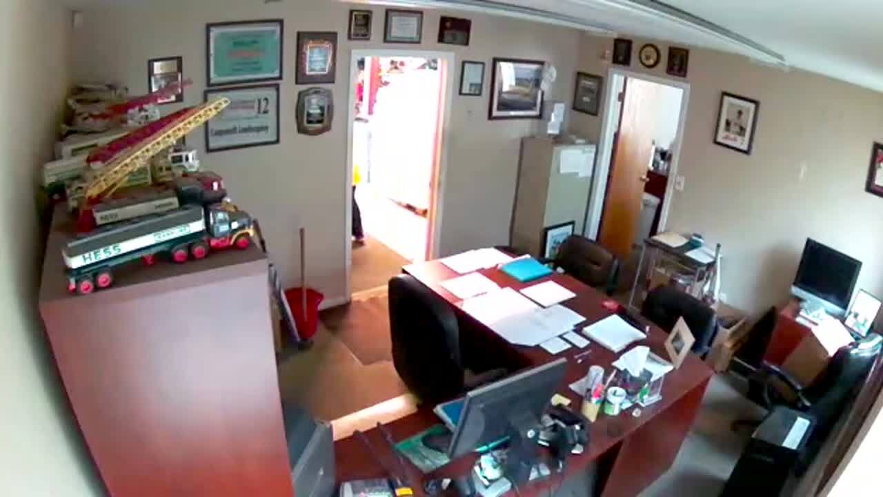Security camera footage of a woman who trips as she walks into an office and falls on the floor.
