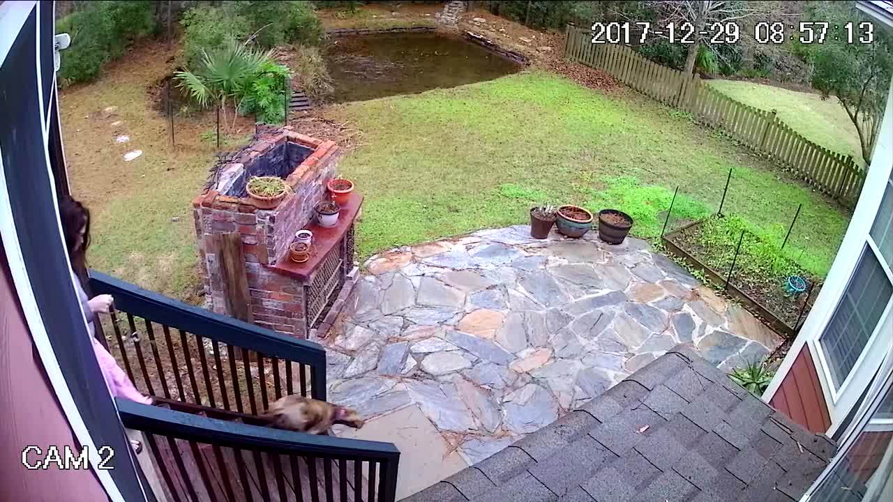 A woman slips and falls on the back steps of her house. Security camera Footage. No Audio.