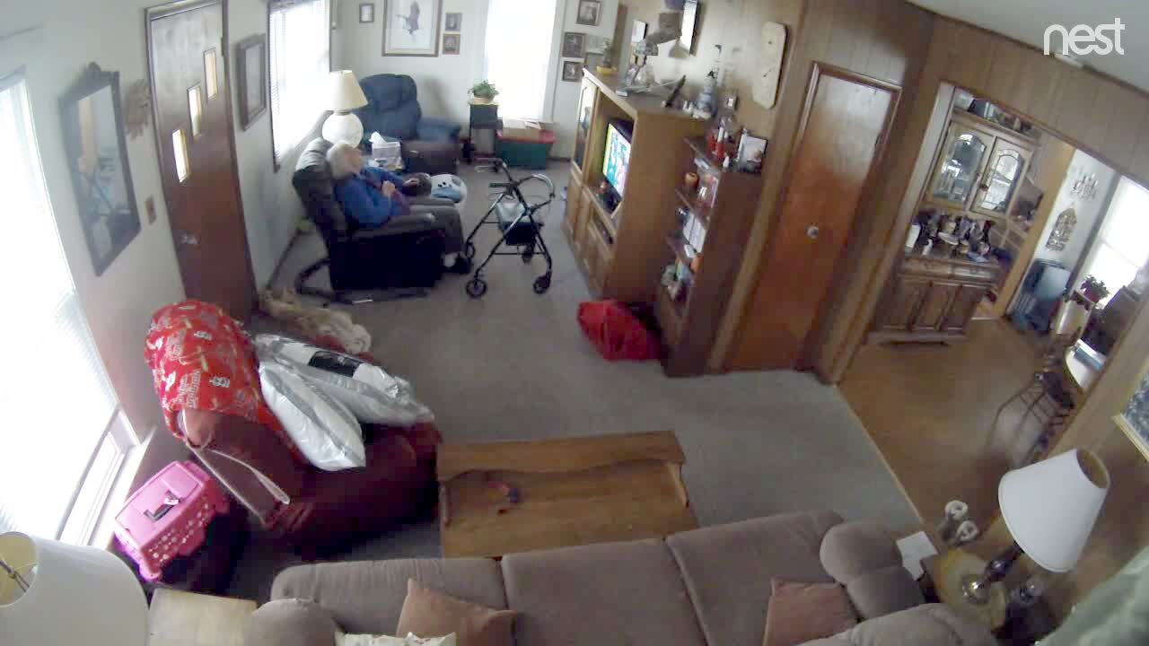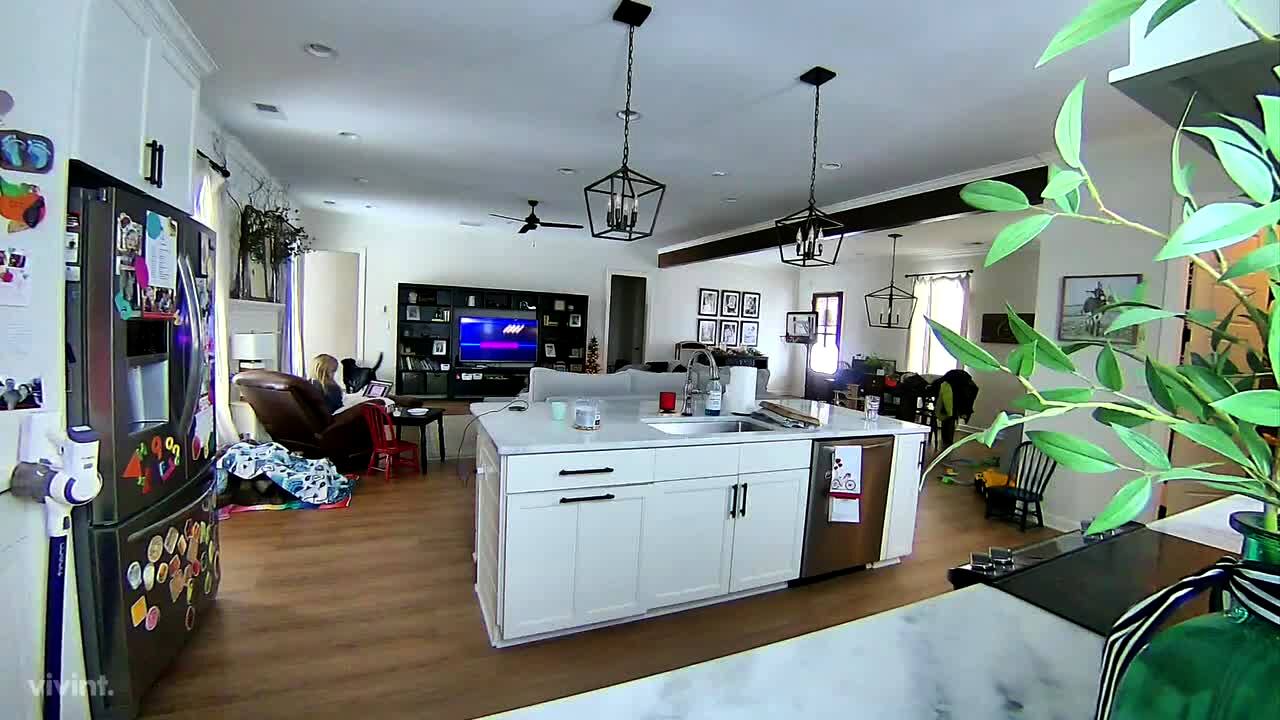 A man's foot breaks through a hole in the kitchen ceiling while a woman talks on the phone. Security footage.
