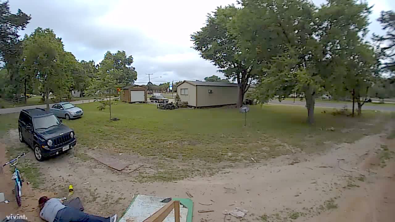 A woman walks out a front door and tumbles off the porch. She falls to the ground and doesn't move. Vivint Security Camera Footage.