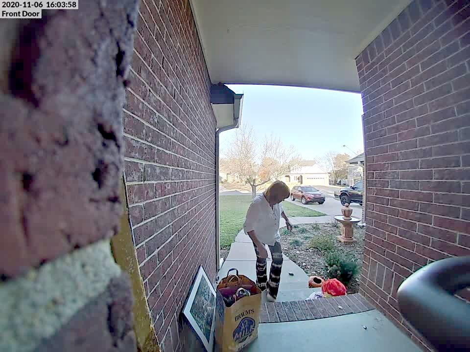 A senior woman drops off gifts for her son and granddaughter on a front porch step, then at :42 she trips and falls backwards on the front lawn. Security camera footage.