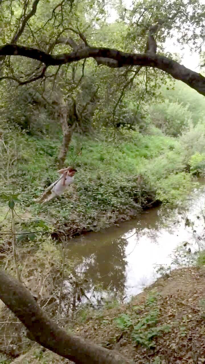 A young boy swings on a rope over a river, his foot gets stuck in the rope when he lets go and he falls in the water.