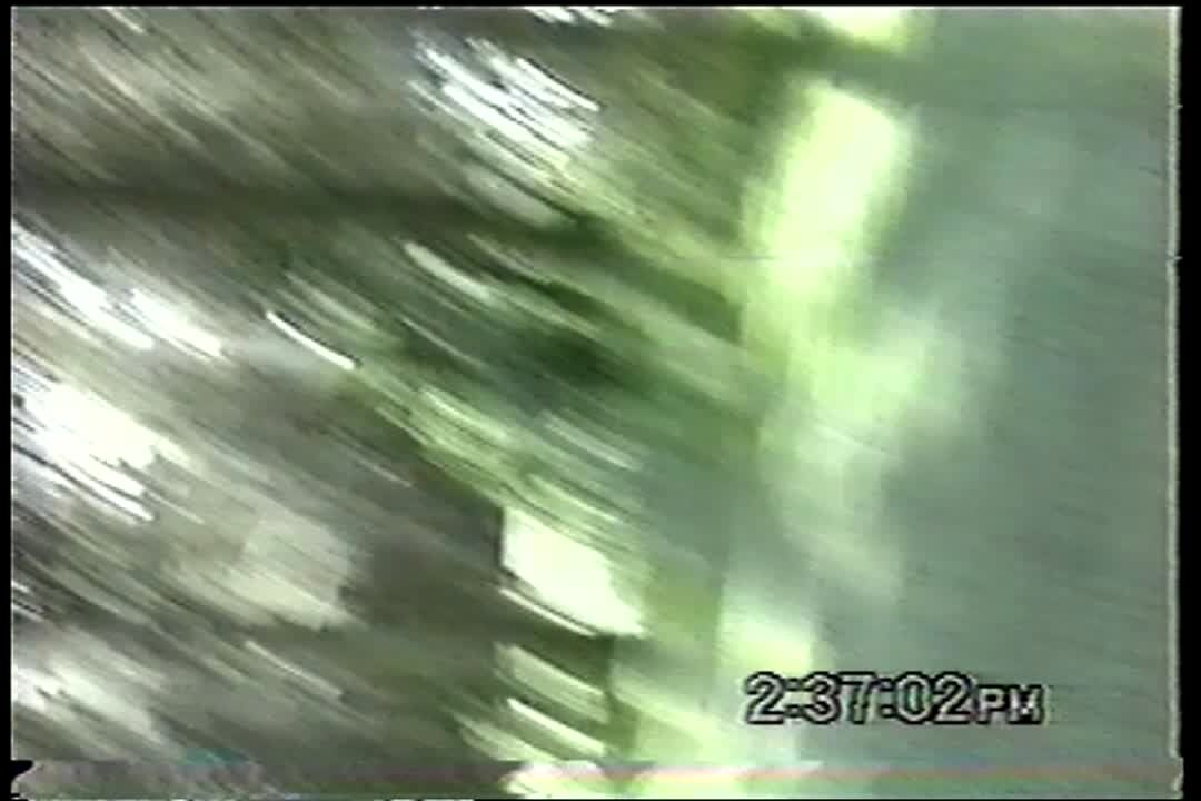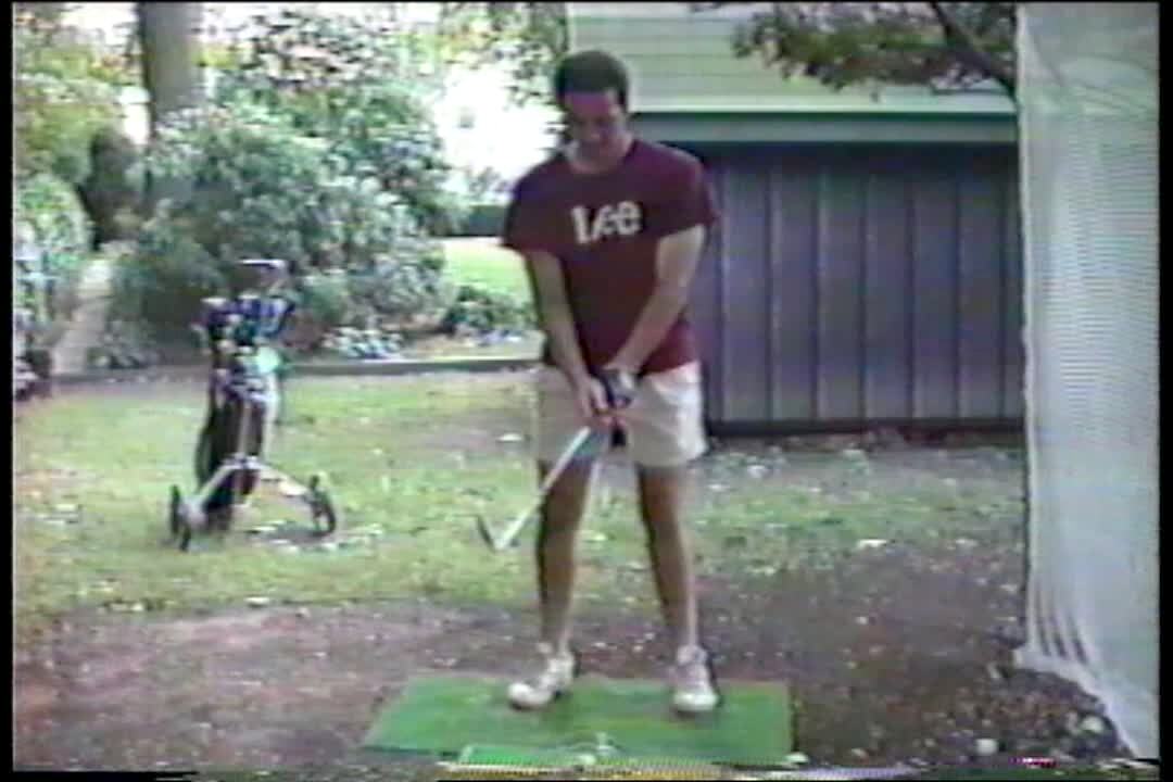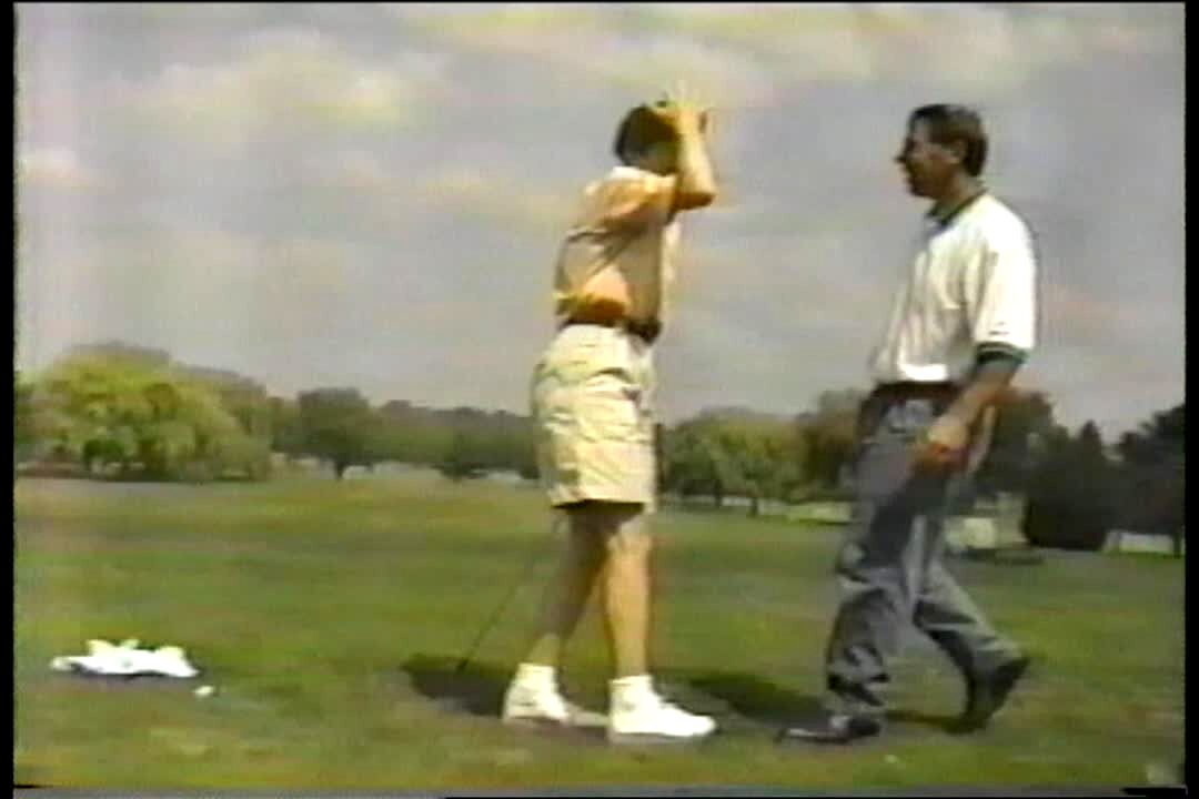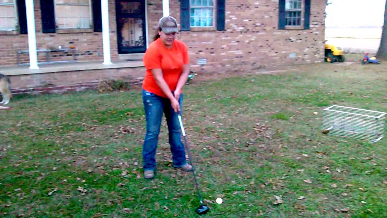 Man hits golf ball towards camera and hits the woman holding the camera in the legs. No tails