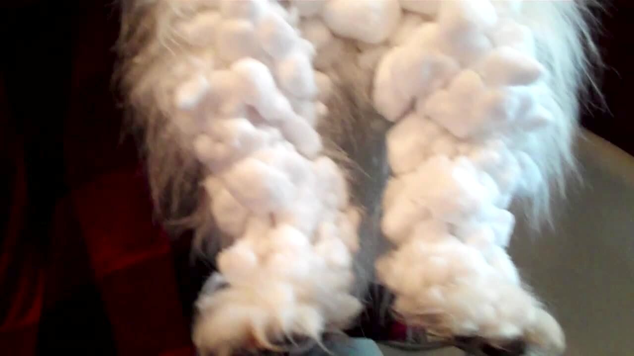 Long-haired shih tzu dog has snowballs formed all over belly after playing out in snow.