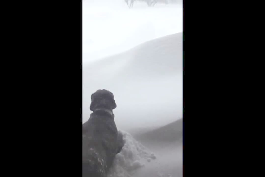 A big dog gets buried in snow at 0:15 when trying to hop into yard.