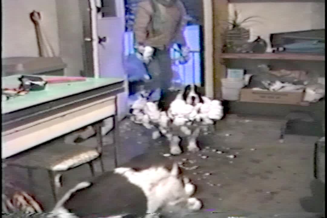Dogs have huge balls of snow on their ears & body. (added outdoor shots)