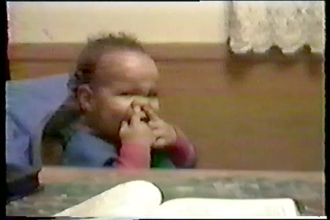 A baby boy enjoys having his dad pretend to eat his nose indoors. Later the baby sleeps, and smiles every time the man makes the same sounds as before. Cute.