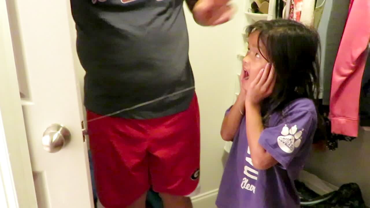 A teen girl falls over backwards when she opens a door at home and a man jumps out at her and yells. Scare. Practical joke.