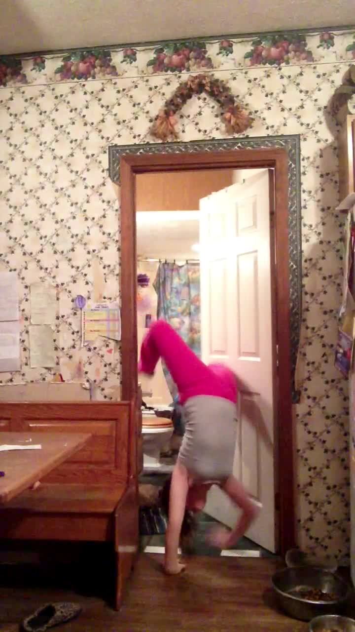 A teen girl tries to do a handstand against a door at home and falls when the door opens.