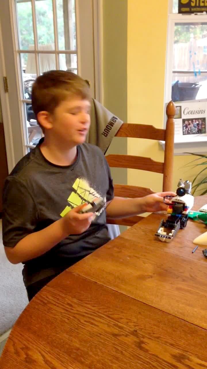 A boy shows a Lego rover that he built from spare parts before he uses a remote control to move it, but instead of going forward, it goes backwards, falls off a table, and breaks.