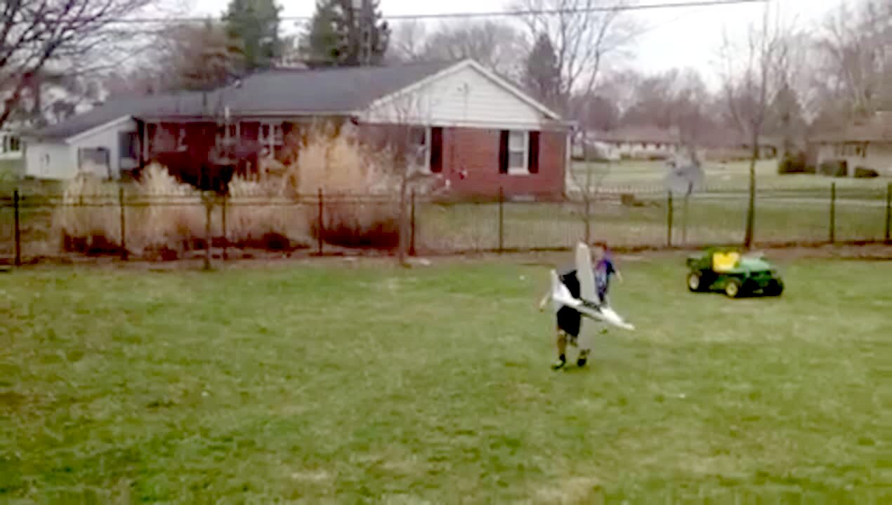Dad tries to fly a toy plane, dad throws it & the plane flies well until it hits boy in the back of the head, knocking him down. With recovery.