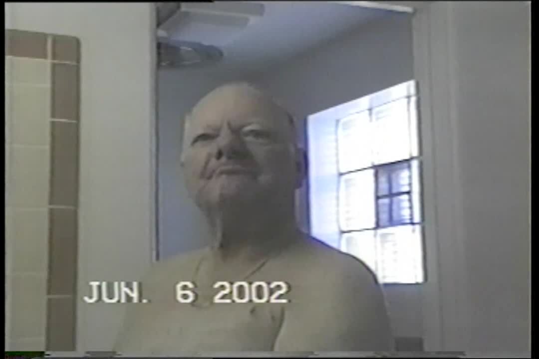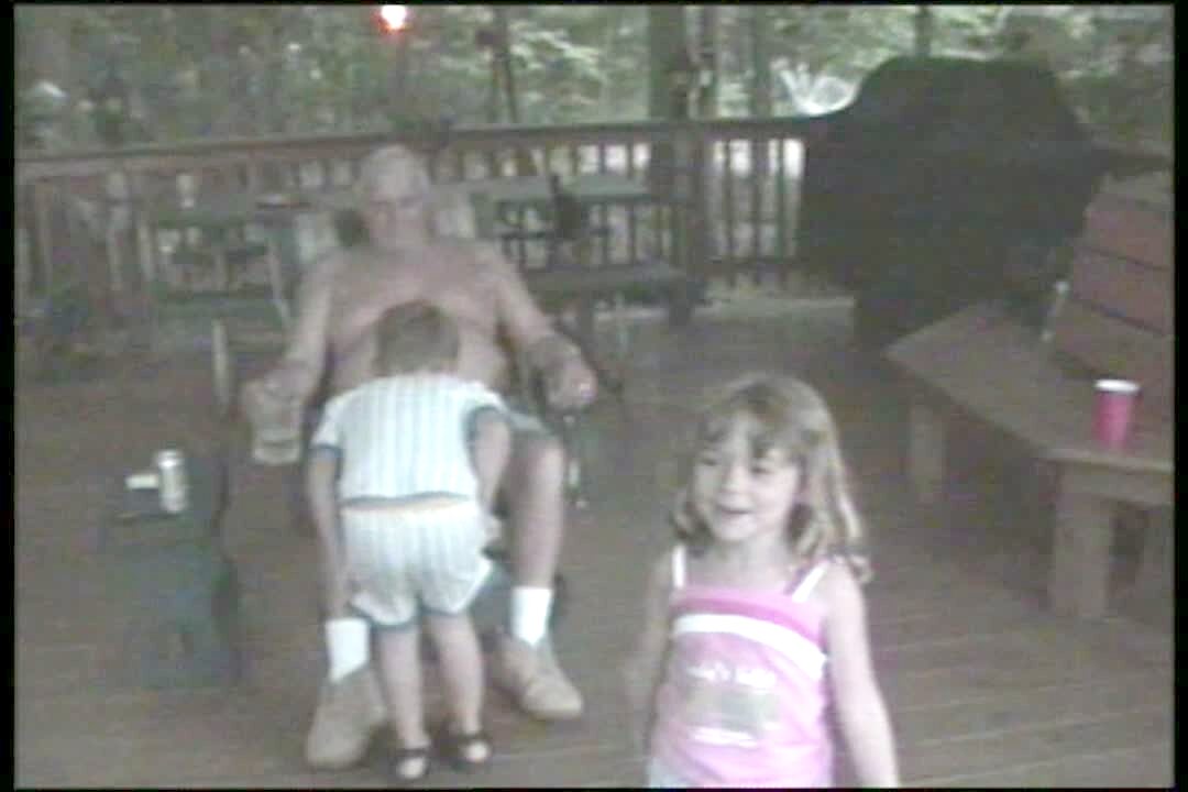 boy puts a lightning bug in grandpa's belly button & his belly button lights up. Funny image Senior man