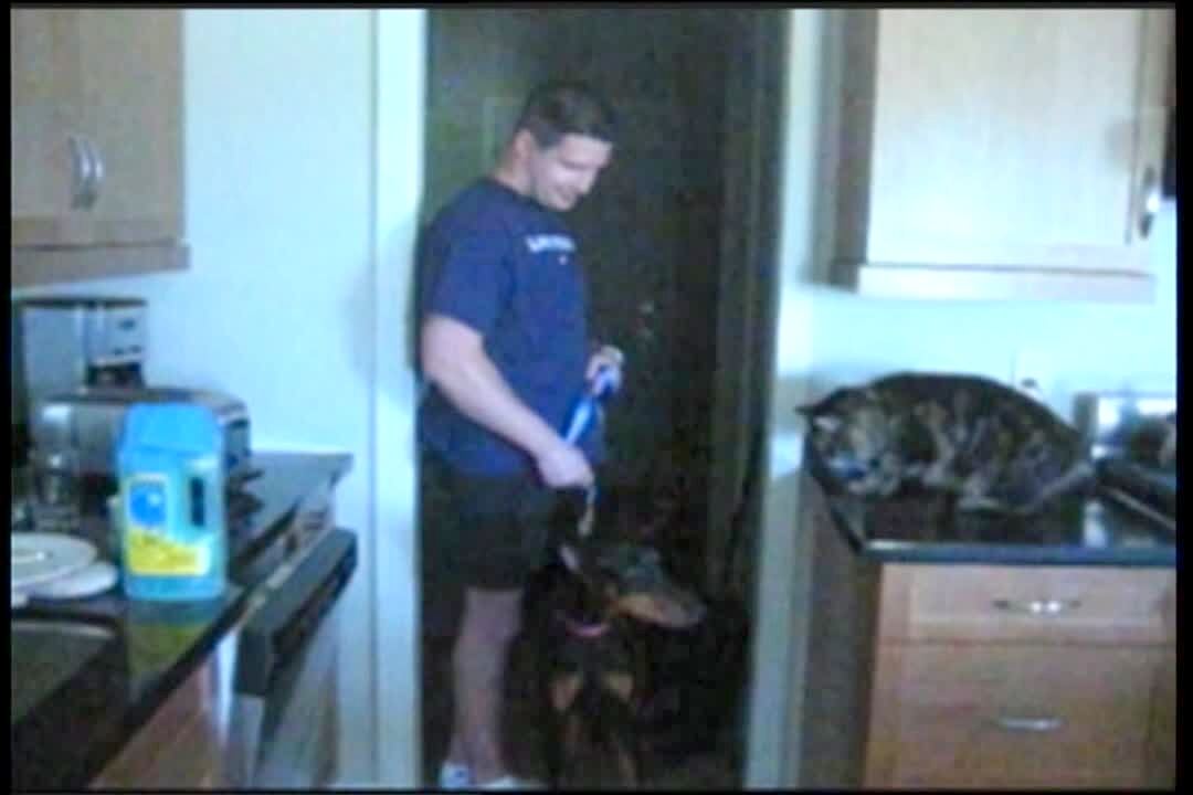 A cat sticks its claws into a man's sock in the living room and he drags it across the floor. It lets go and then chases him back and forth in the room. Eventually, it grabs onto his leg and digs its claws in and he gets hurt.