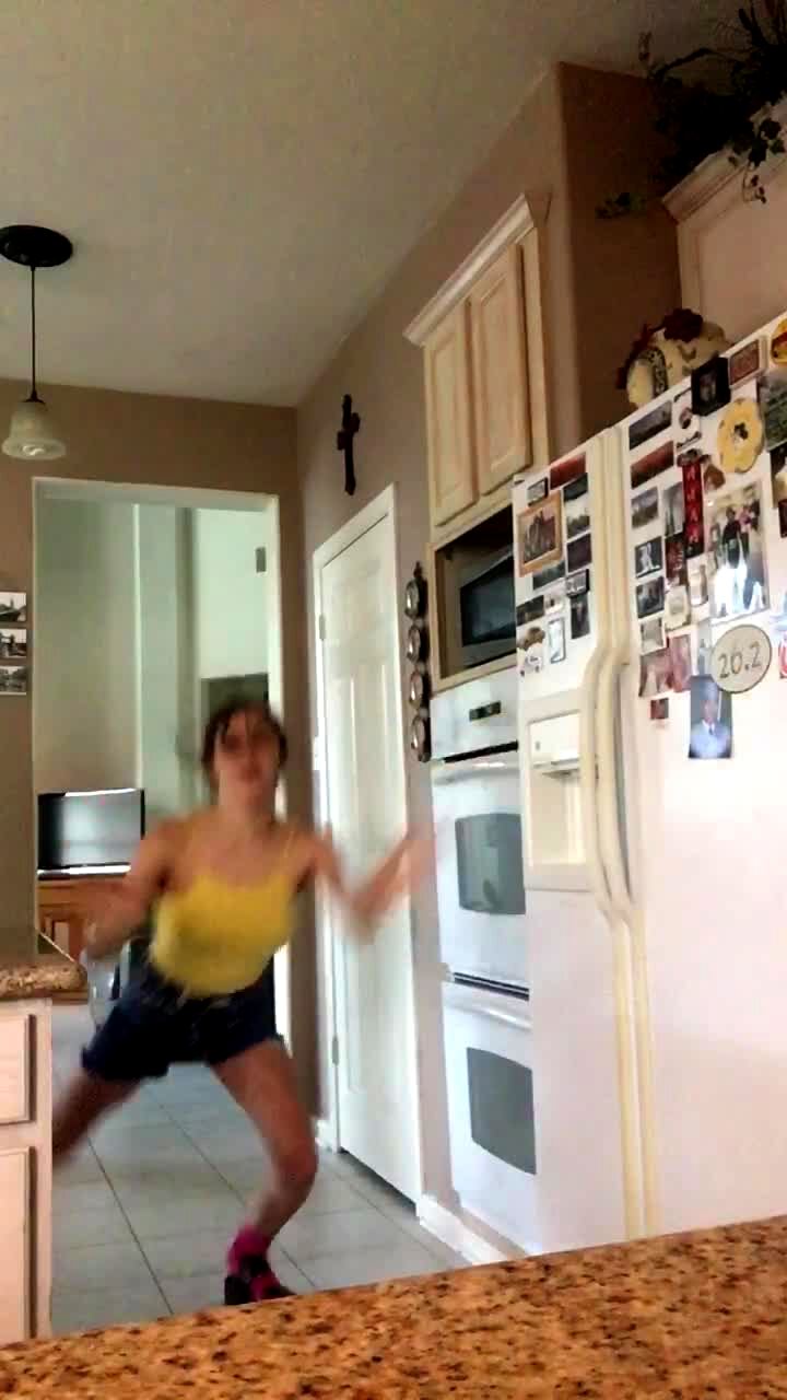 In a kitchen, a young woman holds onto a fridge handle and the kitchen counter and kicks her legs in the air. Her hands then slip, she falls and hits her head against an oven.