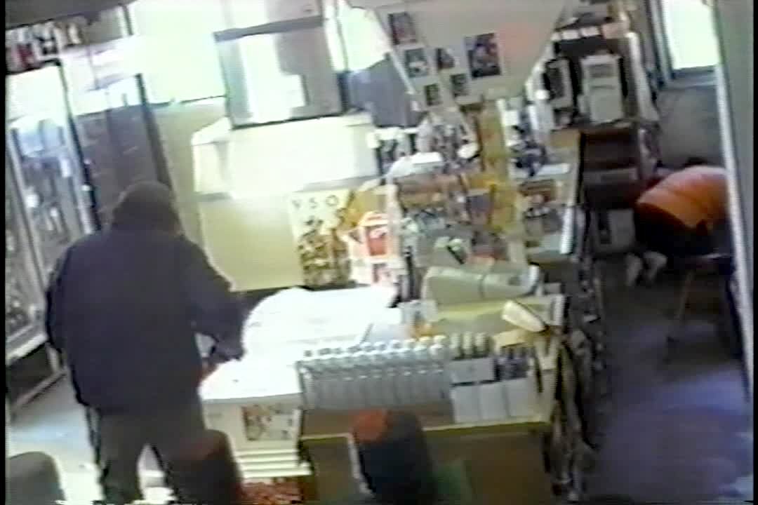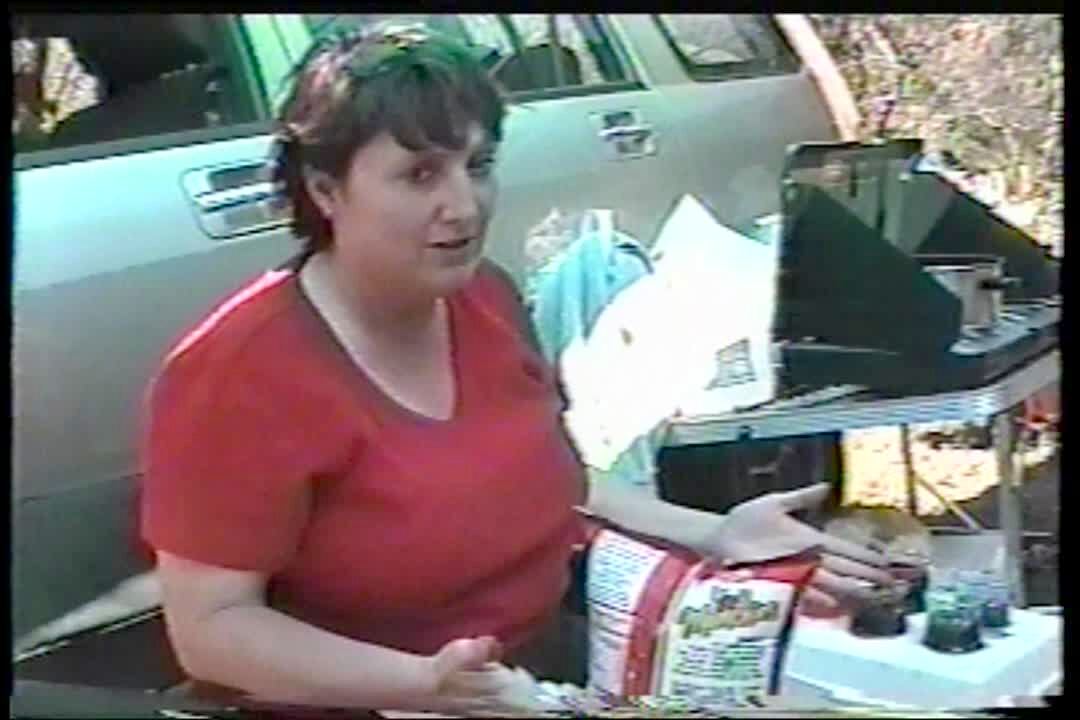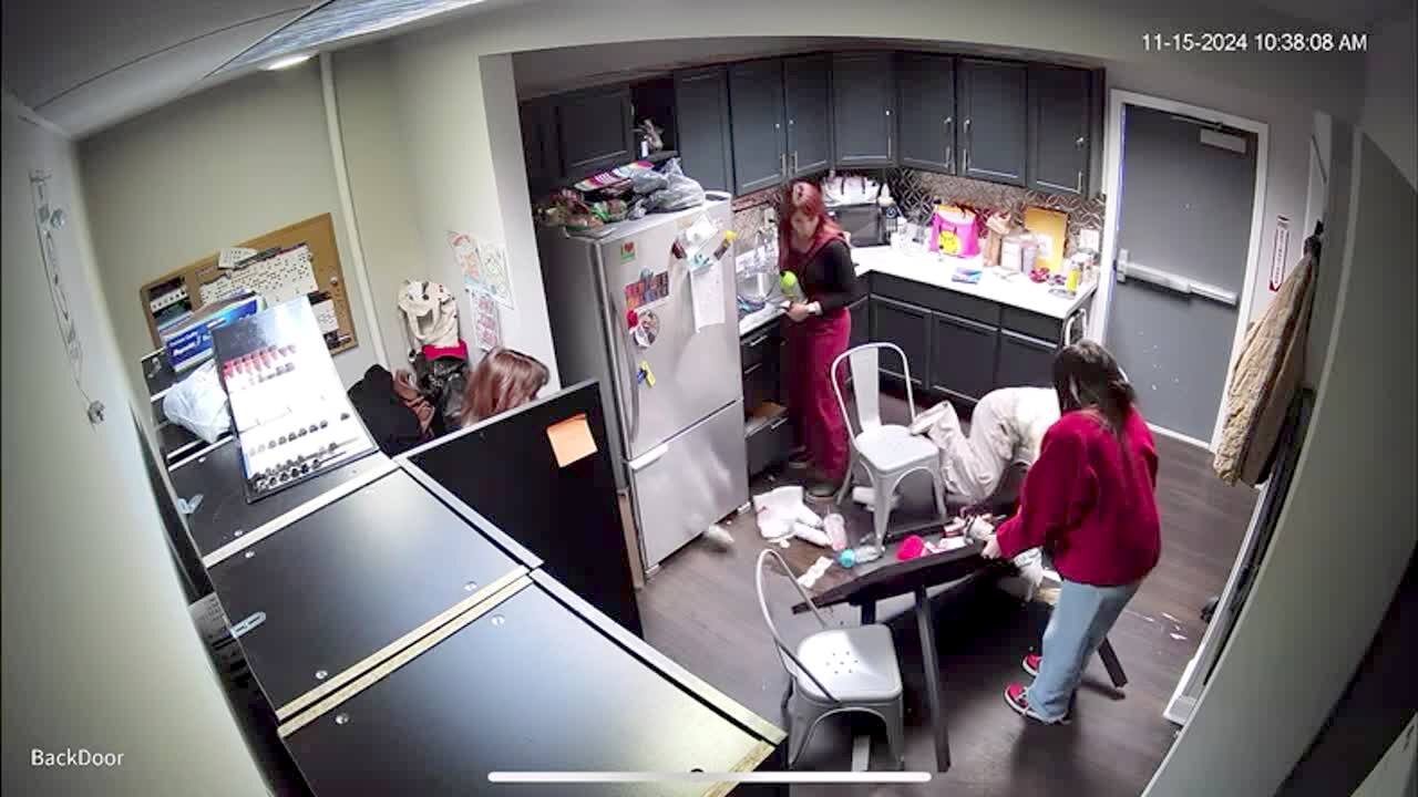 A woman in a restaurant kitchen holds food in her hands as she slips on the floor and falls down. Security camera footage. No audio.