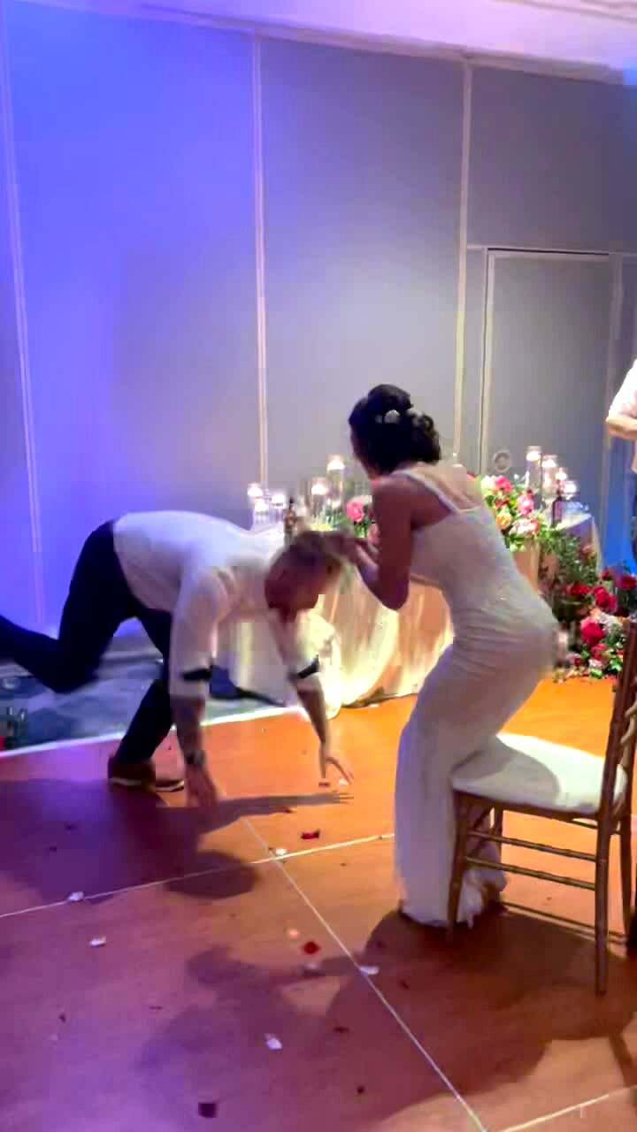 A dad has a rough ride down a spiral slide at a playground dumps out onto the ground.