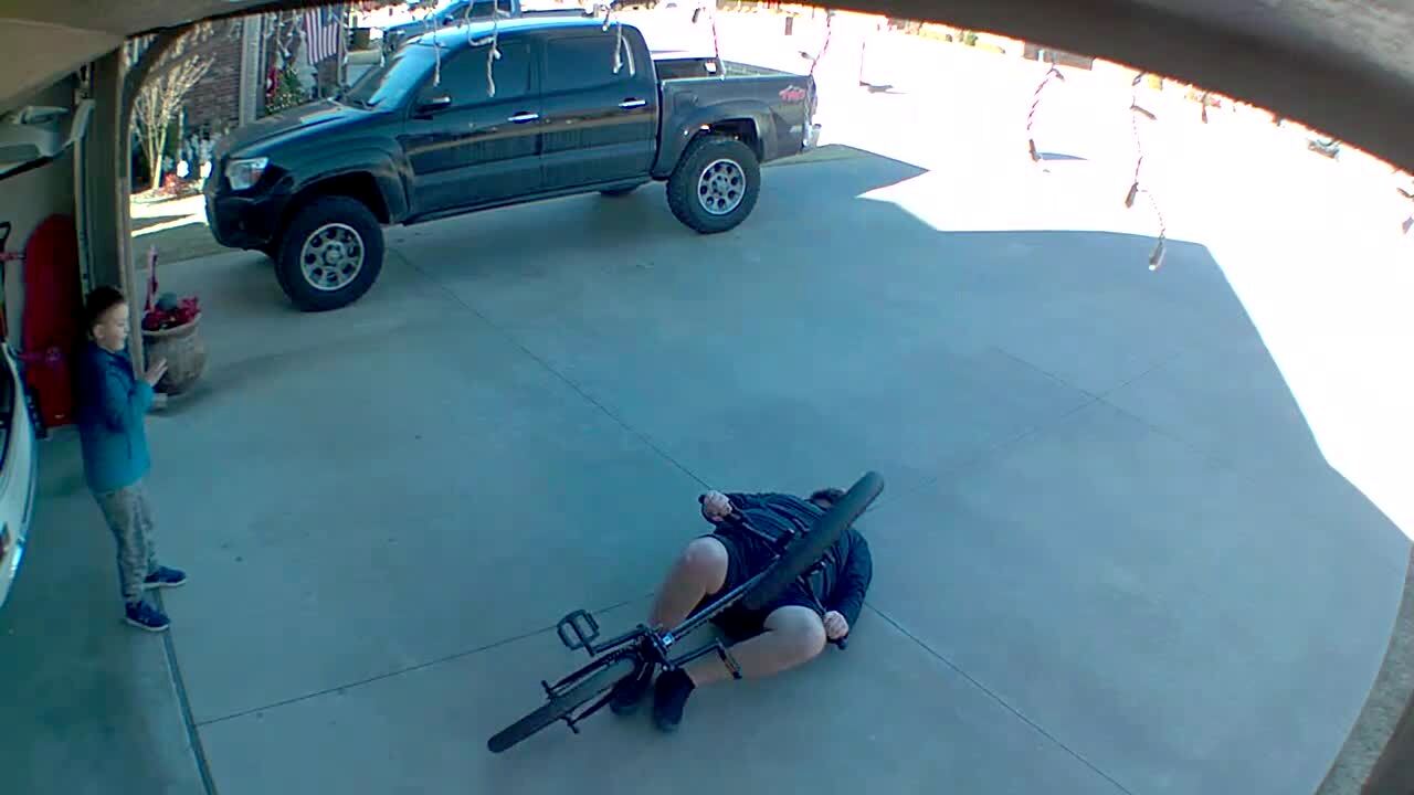 A young boy slips and falls on ice on a driveway, and his shoe falls off. Security footage.