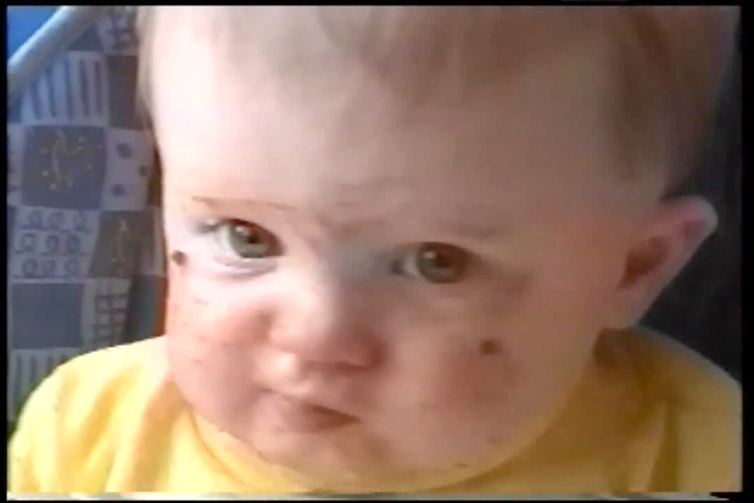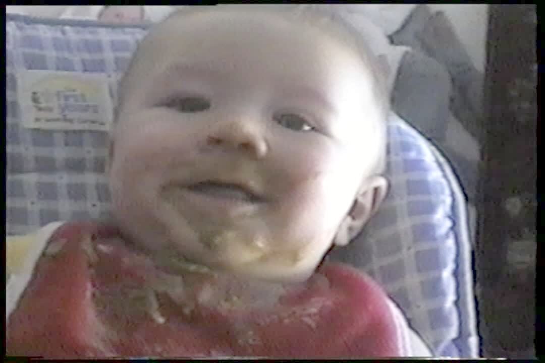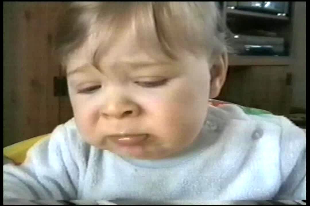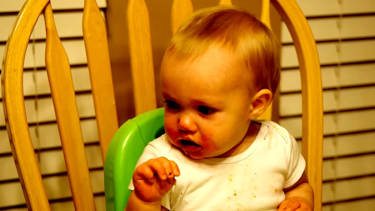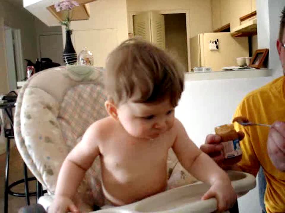 Baby makes horrible, funny face while eating. First foods. Gag.