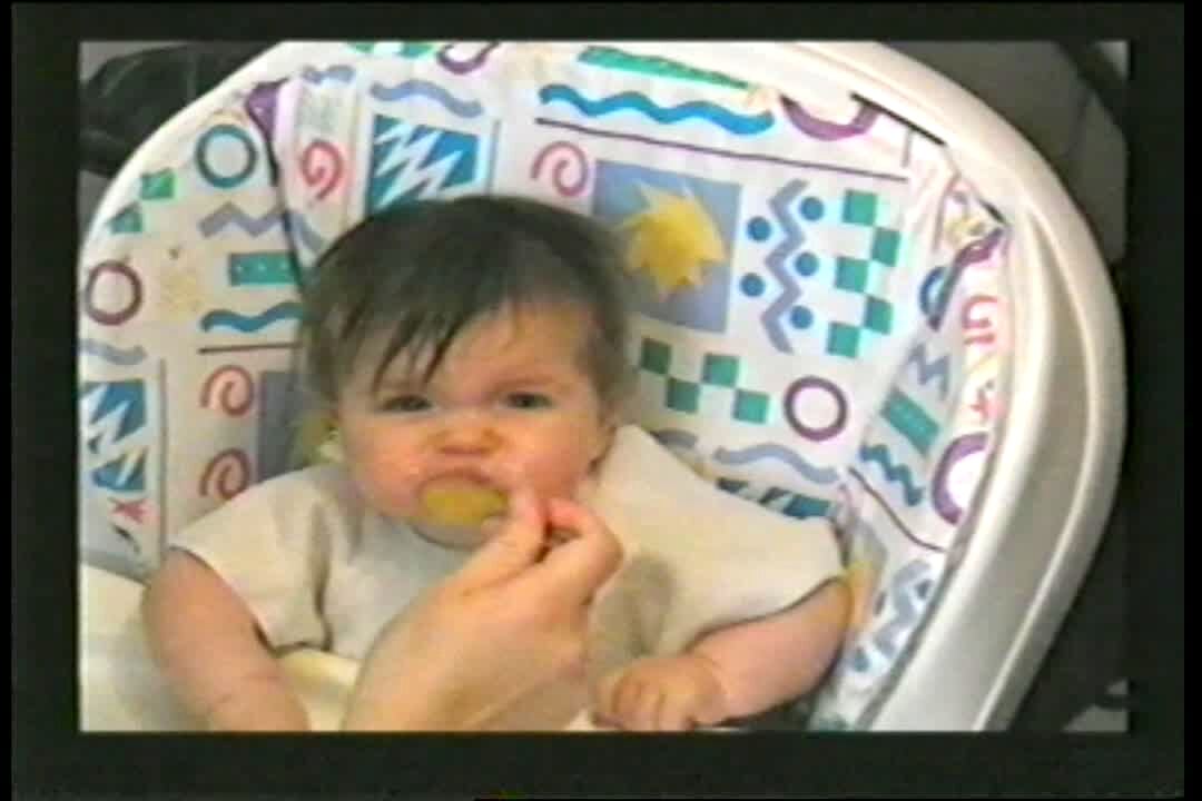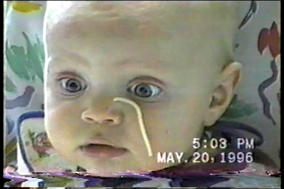 "Linguine Greenie" Baby's face is covered in tomato sauce and parents pull 2 pieces of pasta out of his nose. Linguine Greenie noodle. spaghetti