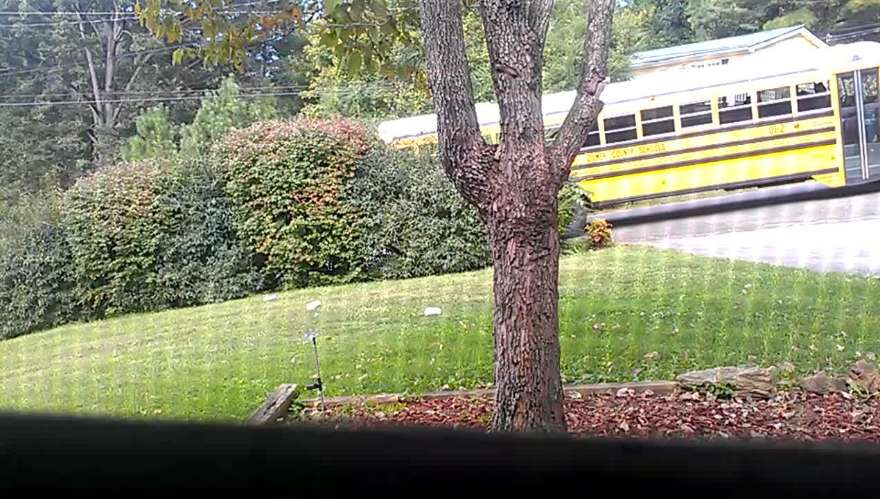 A woman in a Ghillie suit / camouflage suit pops out of a bush and scares three kids after they get off of a school bus.