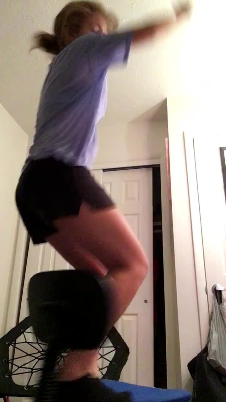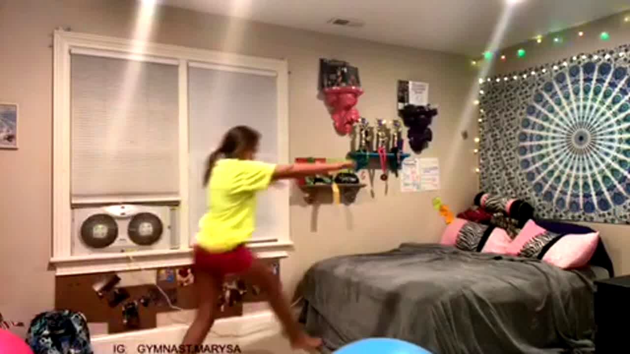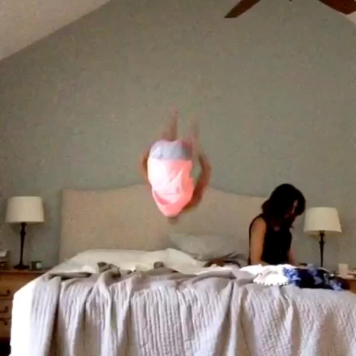 Teen girl does backflips on the bed, she lands the first time but falls off the bed on the 2nd try. A TV set falls on her head.
