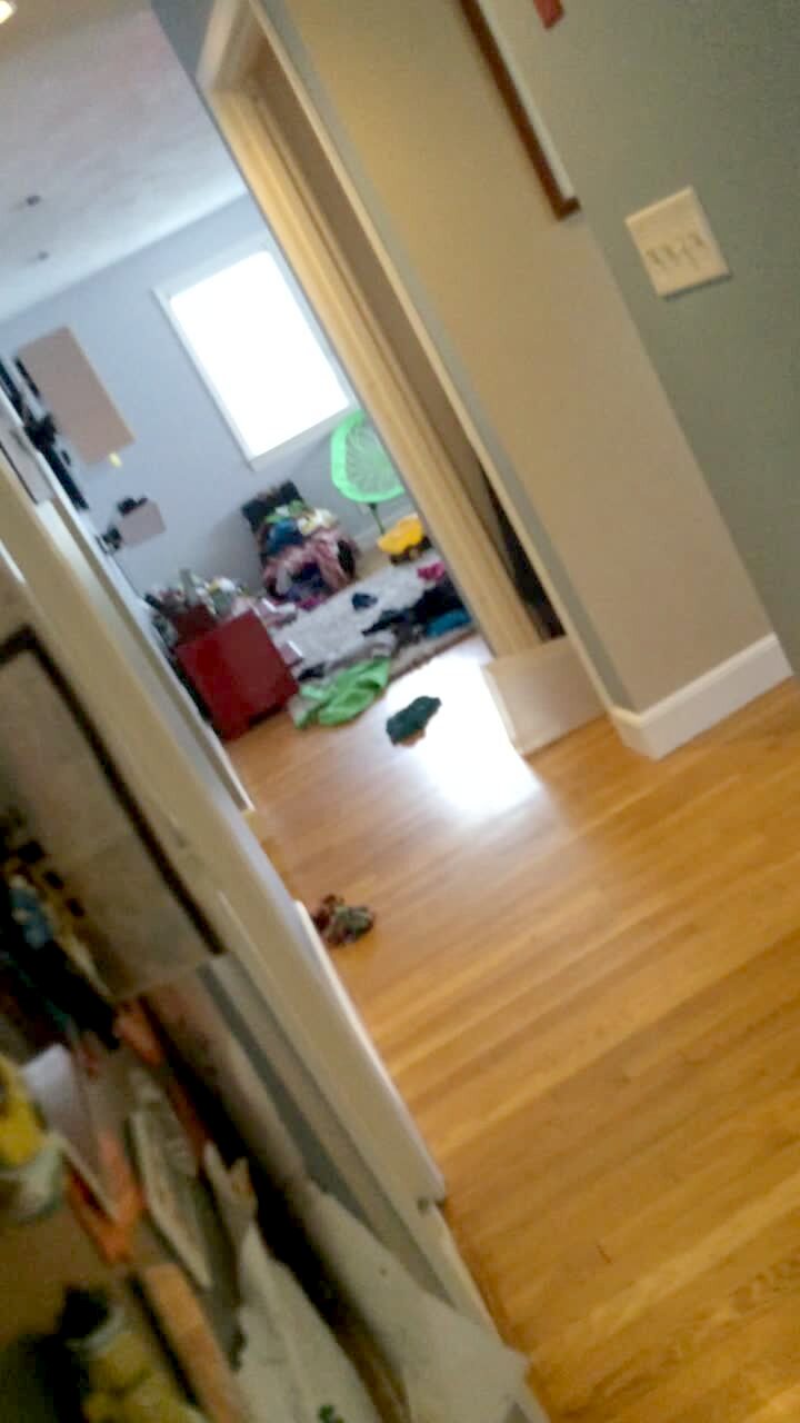 The sound of water can be heard off screen as it hits the carpet in a young girl's bedroom when she cracks a fish tank with her foot while she does a somersault. The lights go dark in the room as she leaves to tell her mother what happened.
