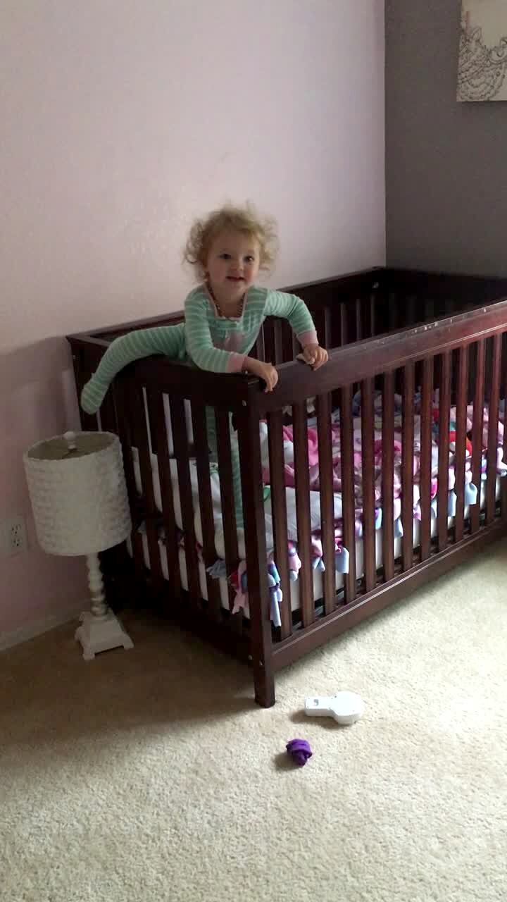 A baby girl climbs out of her crib. She knocks down a lamp and lands on top of it.