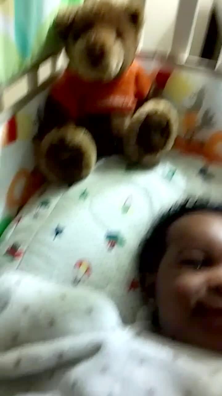 A baby boy laughs when his dad tells him to go to sleep in his bedroom.
