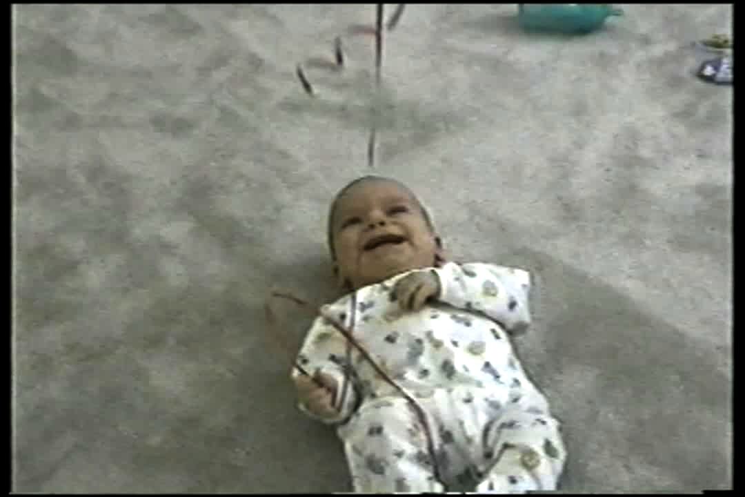 Baby laying on the floor, laughing at a balloon he is pulling.