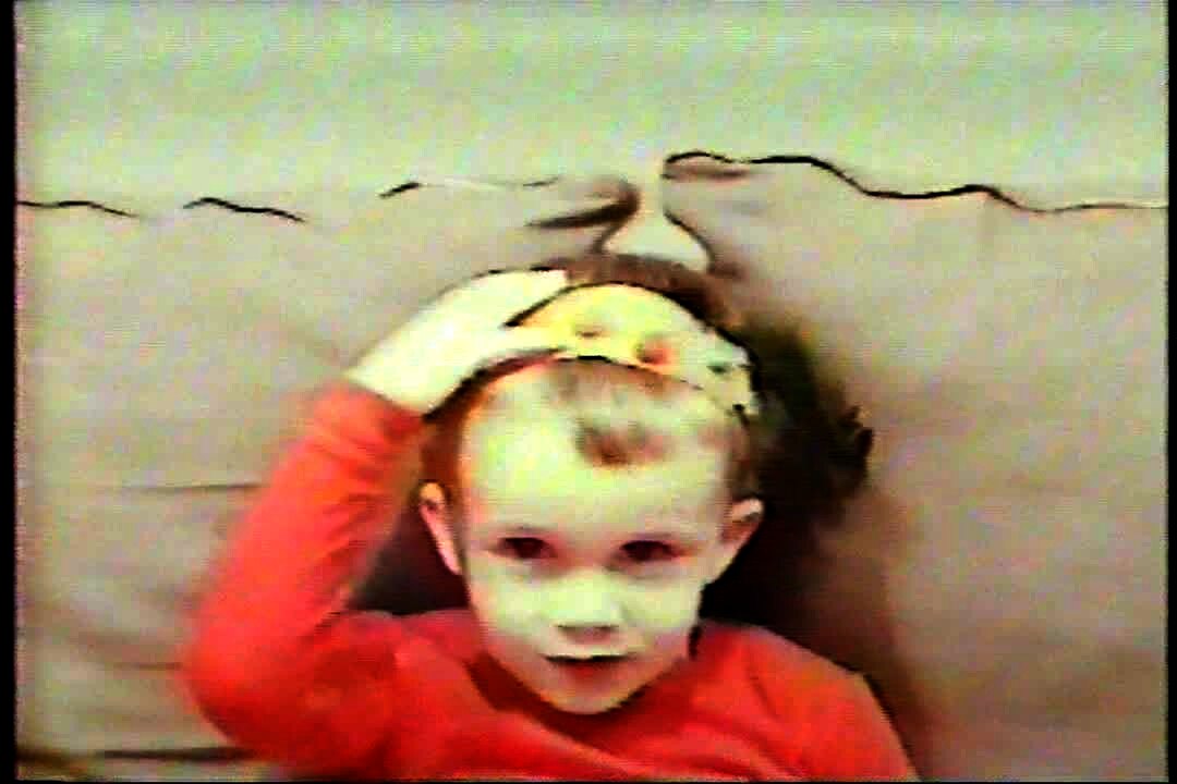Baby boy sits on the floor & laughs at mom blowing raspberries. The 4th time, he flails around and tips over - terrified of the noise. Scared. Surprise. Baby is fine.