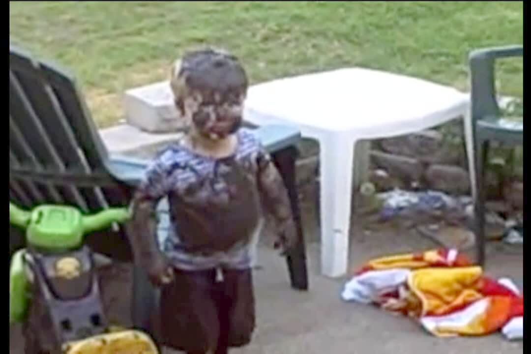 Two tot boys covered in mud play in backyard. Mother asks if they have been in mud today. .