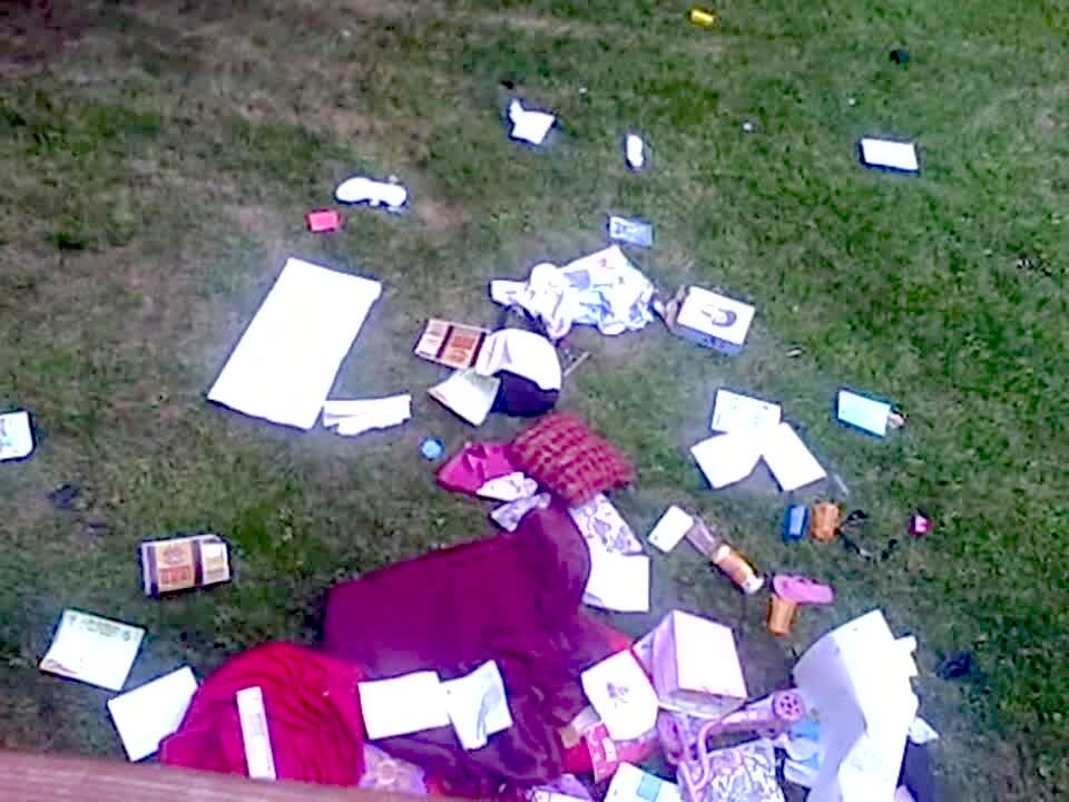 Tot boy walks out onto the porch, man asks if he's been throwing stuff off the porch. Camera pans to reveal tons of toys on the ground. In trouble, mess.