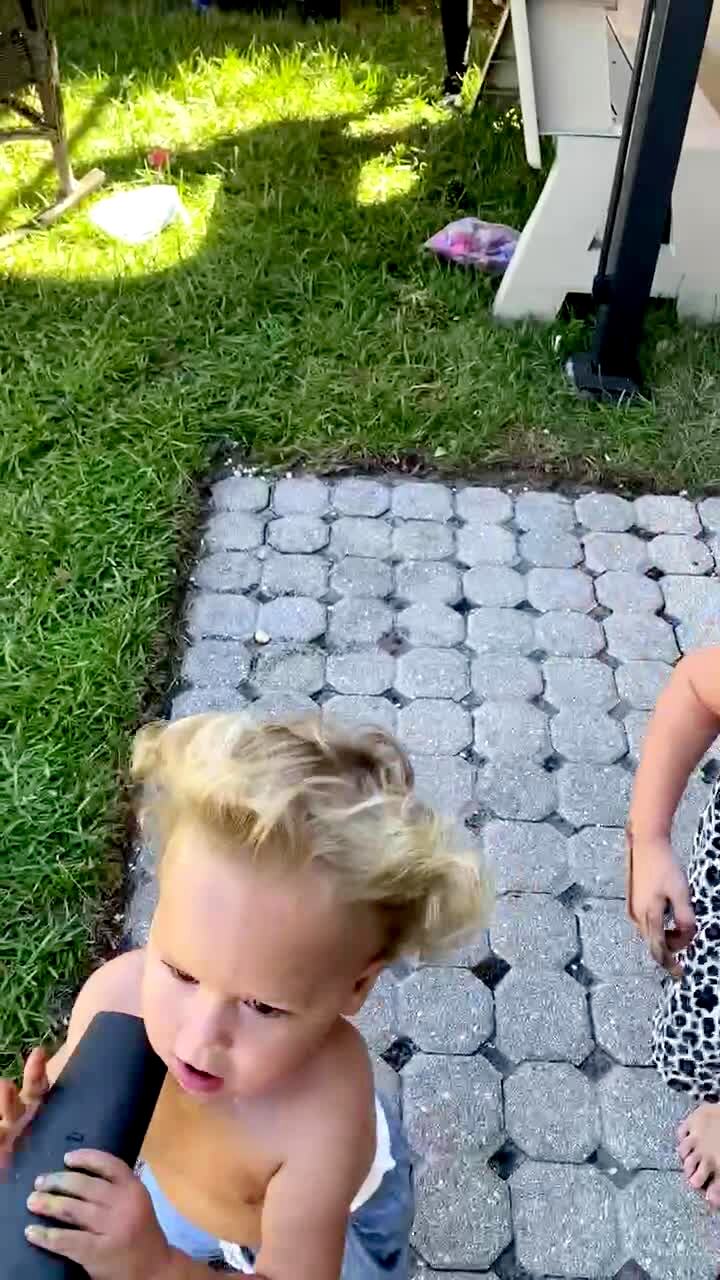 A tot boy drives over the chest of his older toddler brother in a power wheel at 1:40 then drives into the legs of his father.
