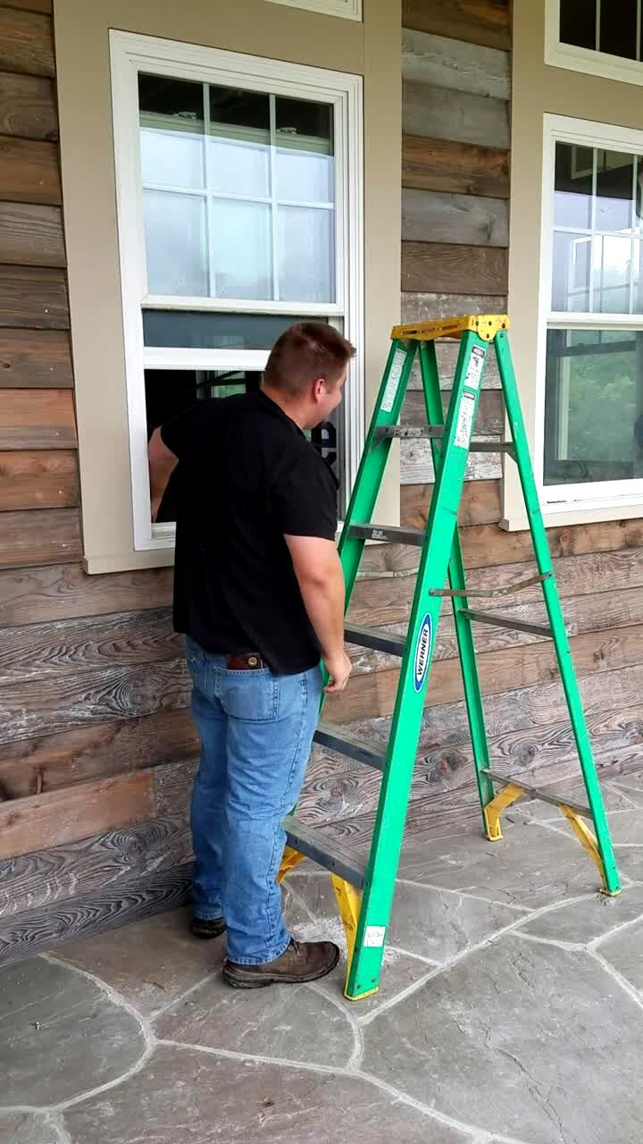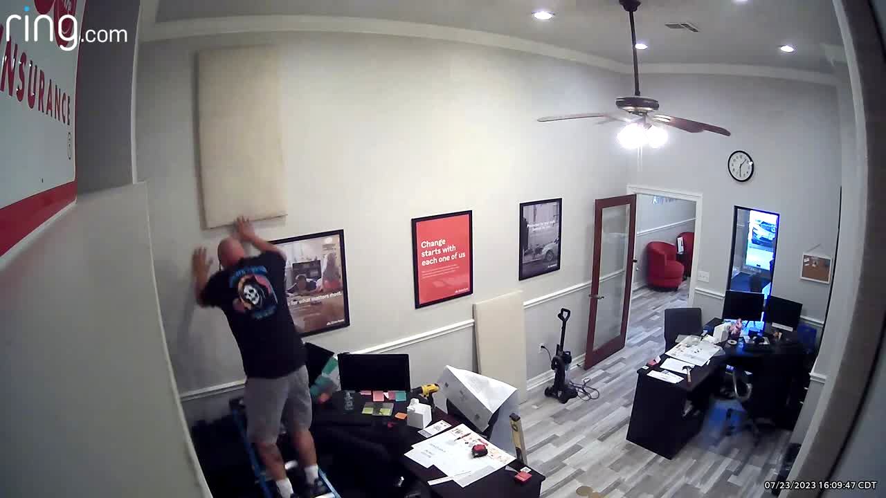 A man attempts to hang an acoustic panel on the wall at his wife's office, when the ladder slides and he falls onto a desk then to the floor. Security footage.
