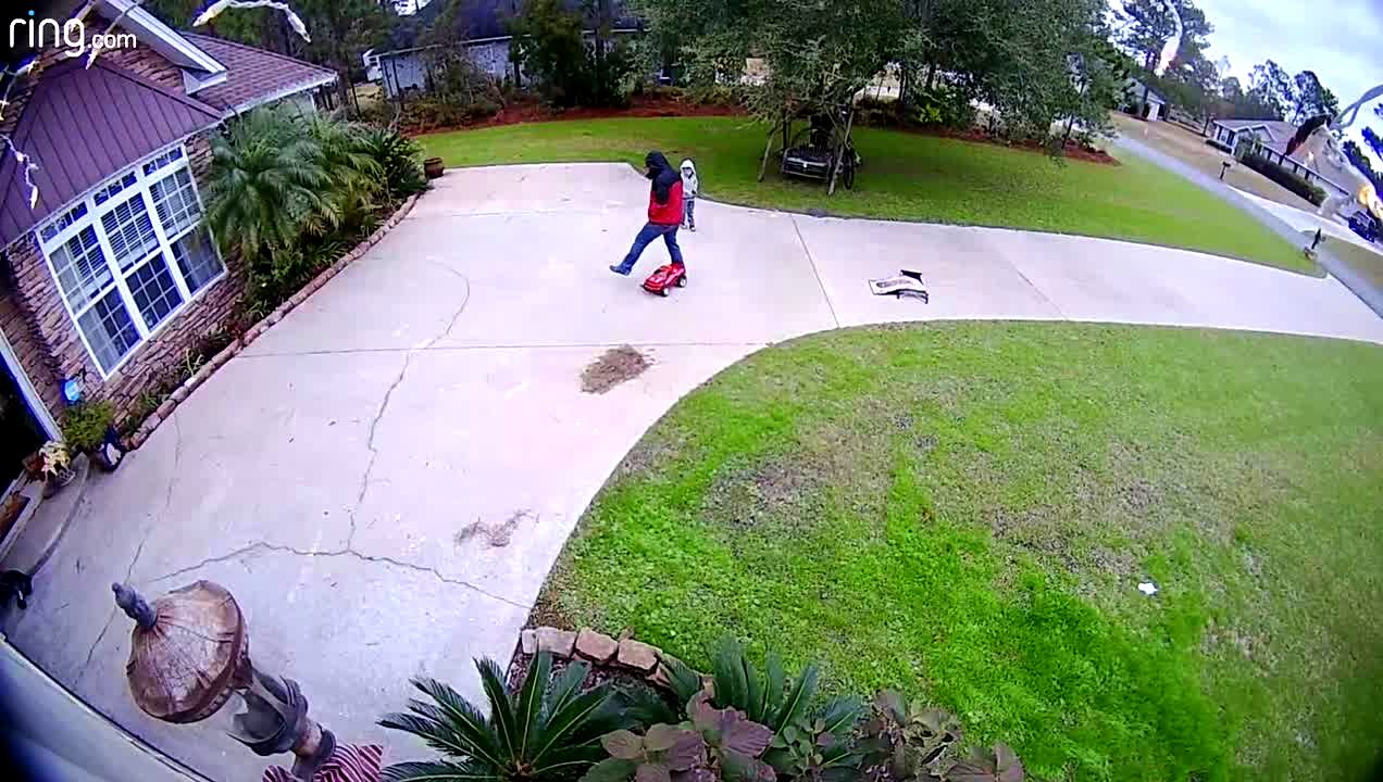 A man steps over his young son's remote controlled truck while the boy drives the truck on a sidewalk. The truck hits the man's leg and he falls on top of the toy and breaks it. The boy cries over his broken toy while the man lays on the ground and hugs the boy. ring.com security camera footage.