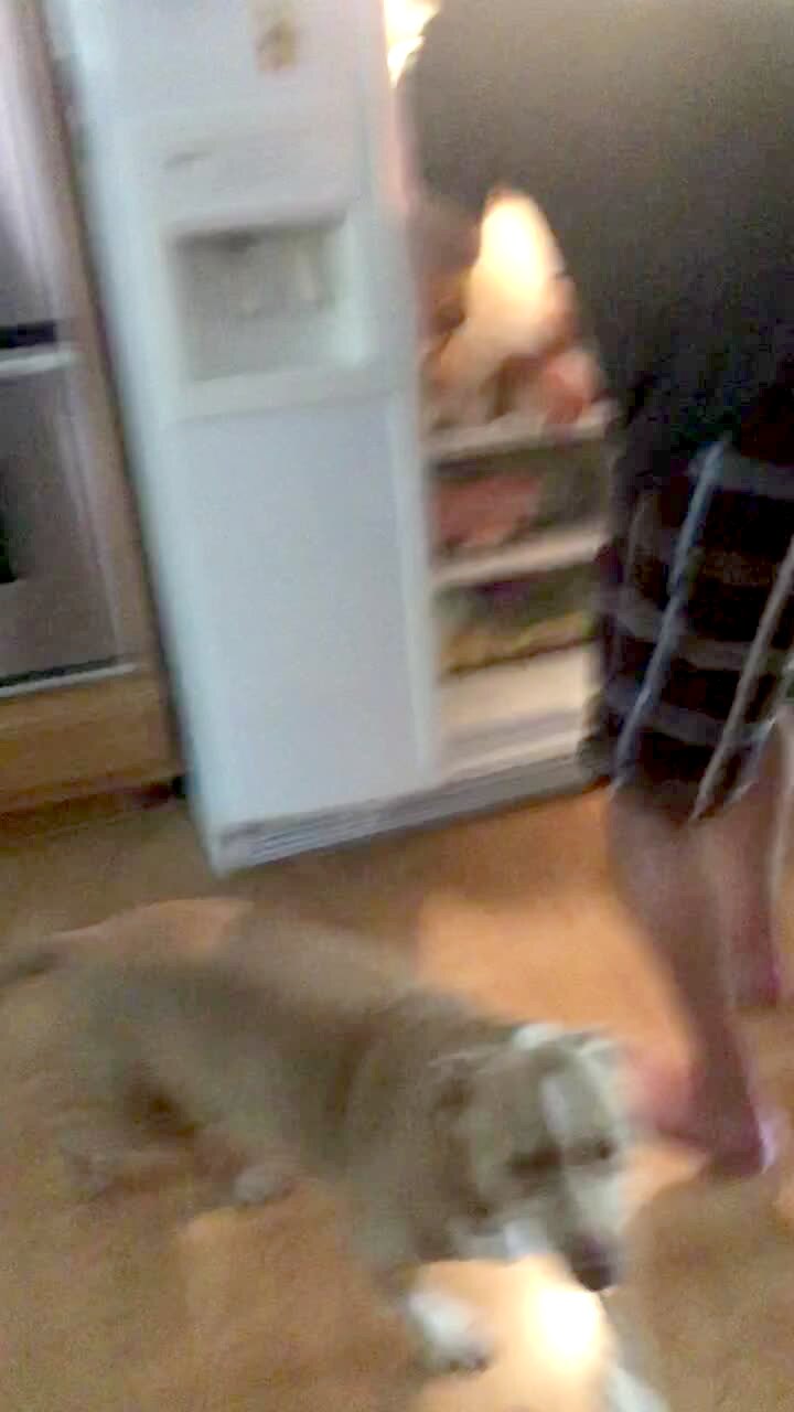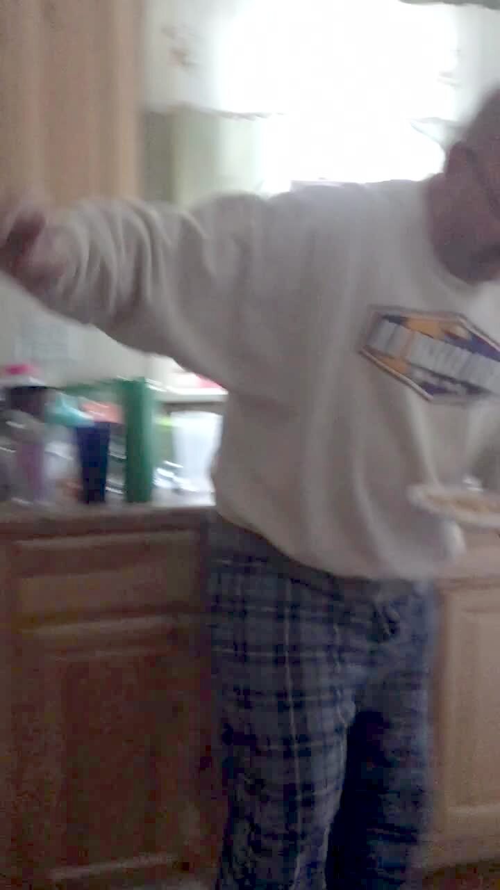 A young woman throws an egg in the air and tries to catch it in her mouth in the kitchen, but she catches it in her hand and falls over the open dishwasher. No audio. Screen recording. Facetime video.