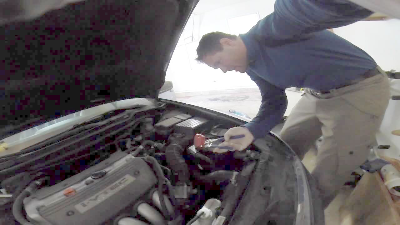 �Honk Under the Hood� A man changes a car battery and is startled by a little boy honking the horn from inside the car in a garage.
