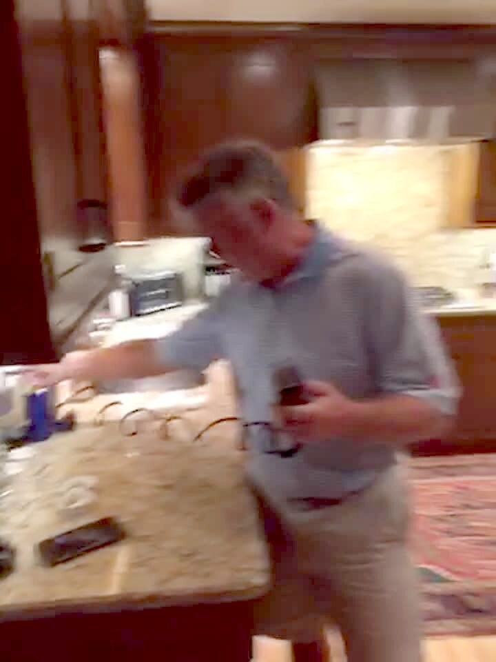 A man in his kitchen shows off his barber clippers that are "made in America". When he tries to turn them on, blue sparks shoot out, and he drops them to the floor.