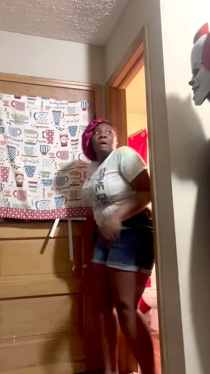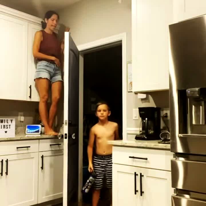 A woman stands on a kitchen counter to scare a young boy when he walks into the room, and she does, but her shorts get stuck on a cabinet door, and it breaks off when she gets down.