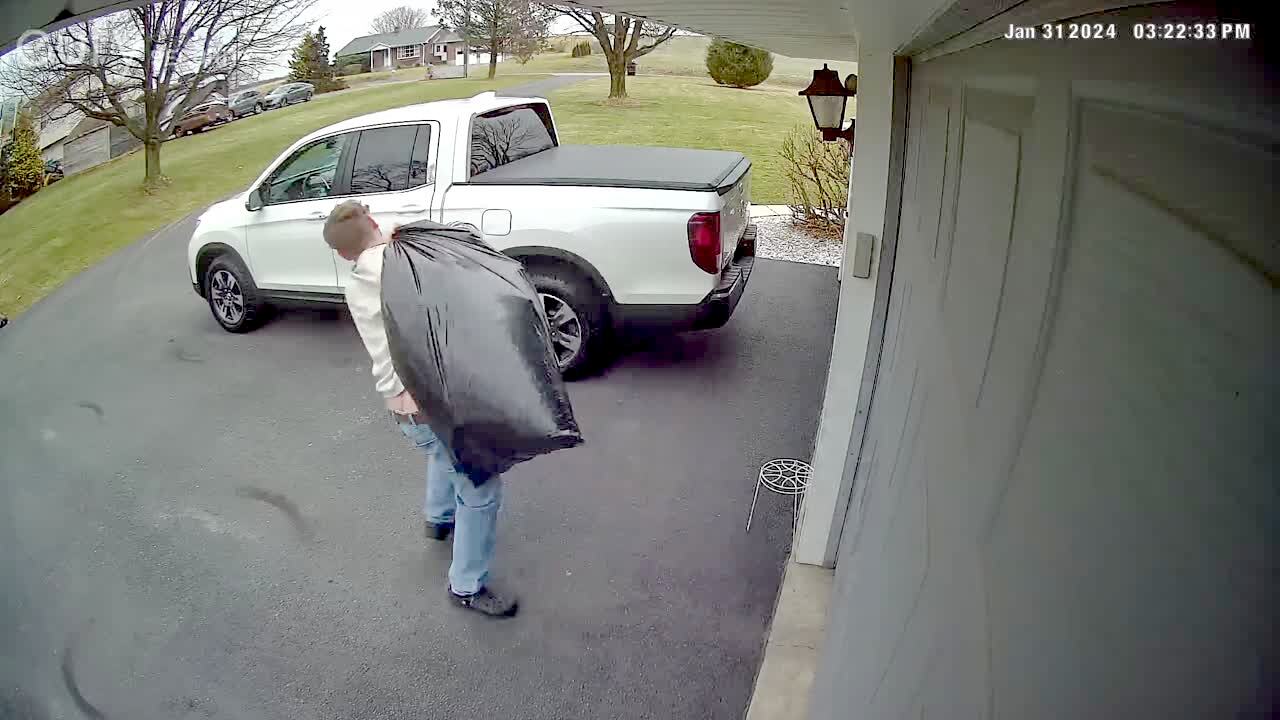 A teen boy lifts a heavy trash bag in the driveway outside of the house and throws the bag over his shoulder and falls backwards into the garage door. Security-footage.