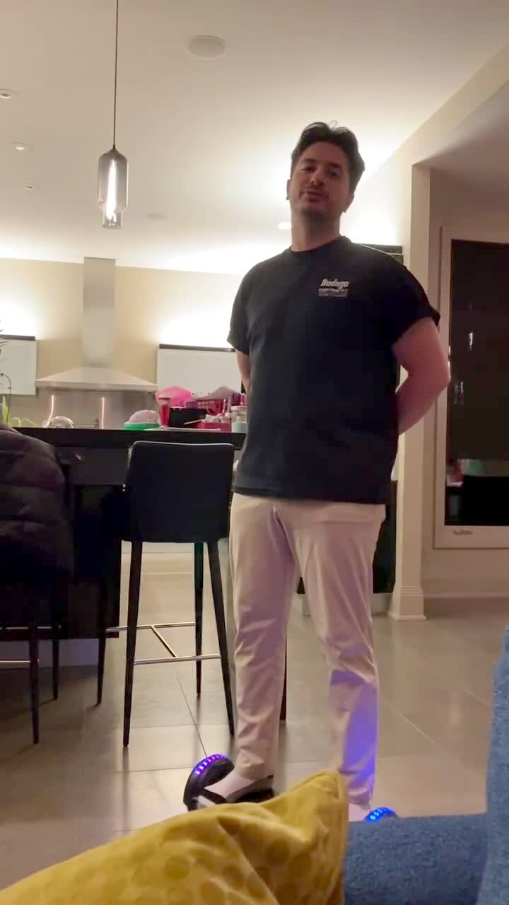 A man rides a hoverboard from the kitchen to the living room. He asks people off-camera if they'd like anything from the chateau. They say no, he rides away but slips and falls backwards onto his back. Everyone laughs.