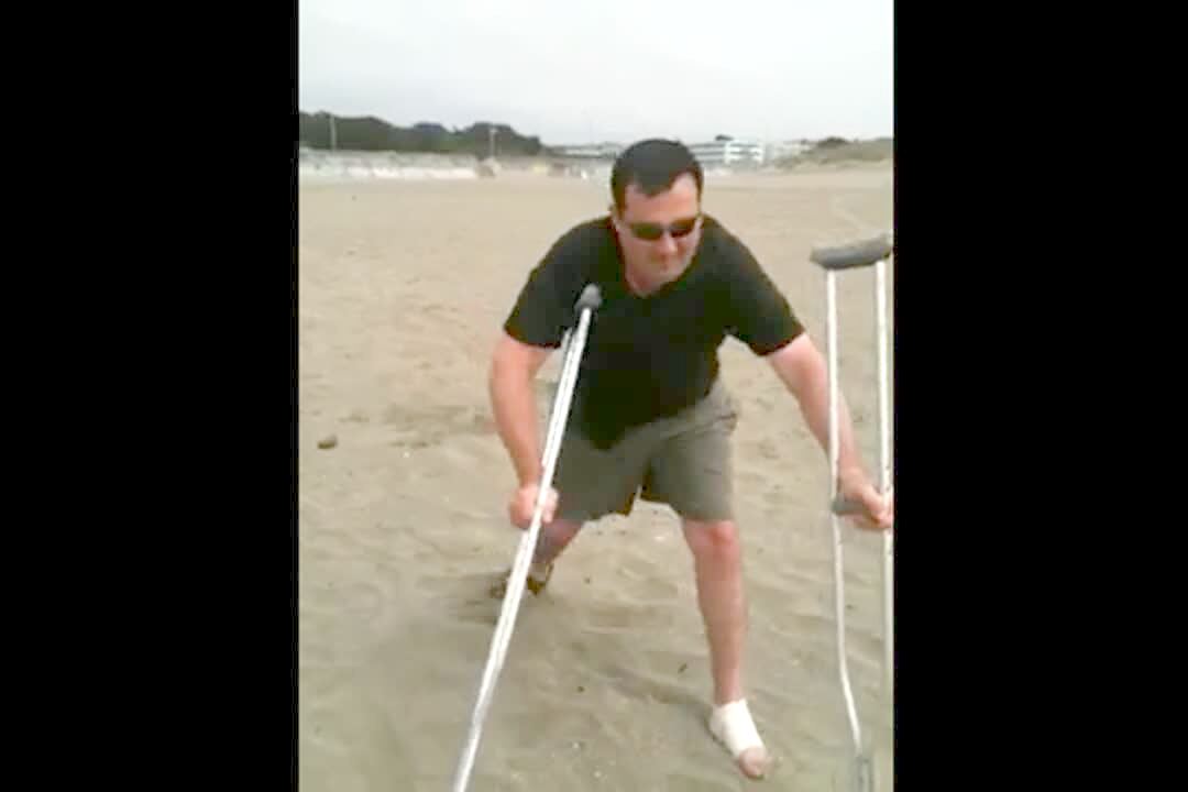 A man on crutches tries to walk on a beach and fall immediately.