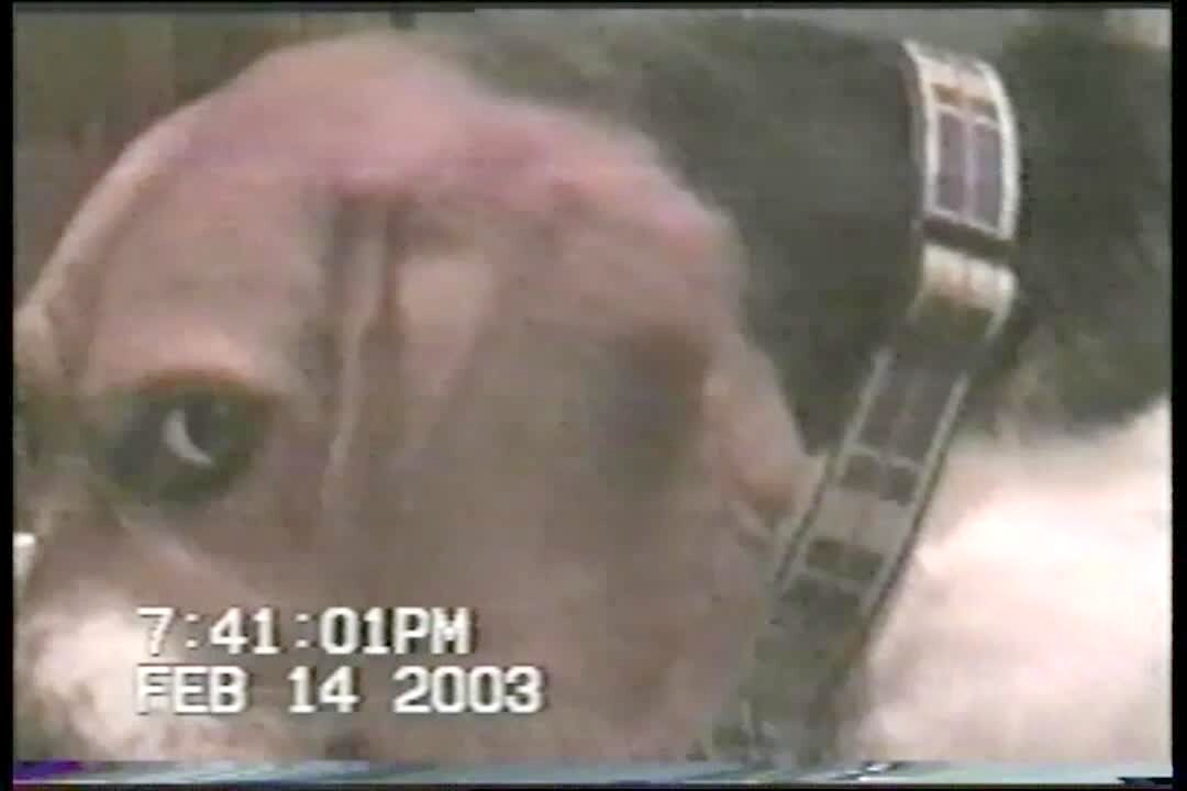 A pit bull dog gets stuck on the bottom rack of the dishwasher, then drags the rack across the kitchen floor. Security footage.