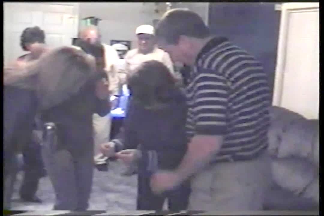 People dress up a punching dummy as a burglar and hide him in a shower. They tell man to look into shower. He gets scared / surprised/ shocked. Everyone laughs. Close up of dummy at end. Practical joke.