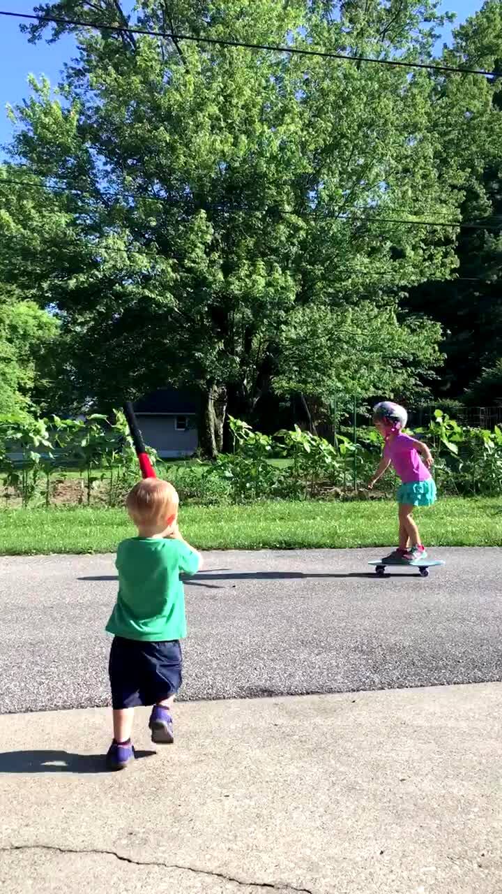 A young girl rides a skateboard in the driveway and a tot boy runs towards her with a baseball bat. She gets scared and runs away and her brother gets on the skateboard. She comes back and pulls him off and gets the skateboard back for herself.