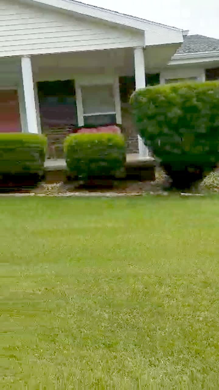 A woman throws a ball that explodes to a man with a baseball bat for a gender reveal in the yard. Her husband hits the ball and part of it hits his wife in the back and she falls.