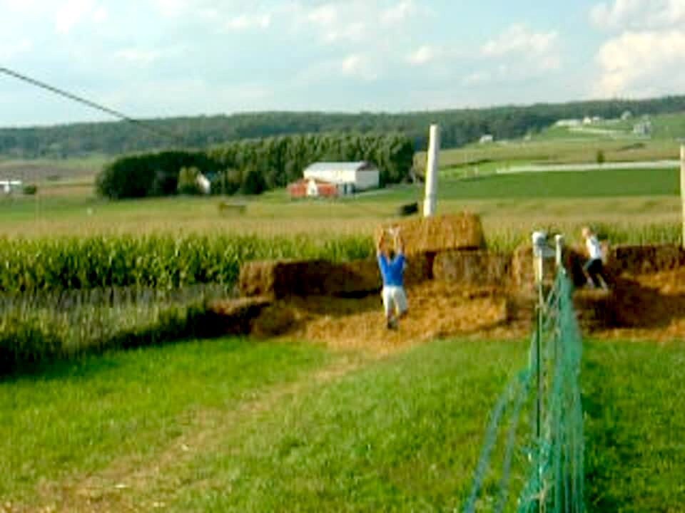 Man rides a zipline at a cornfield maze. He flips off and lands on his back instead of the bales of hay put there for safety.