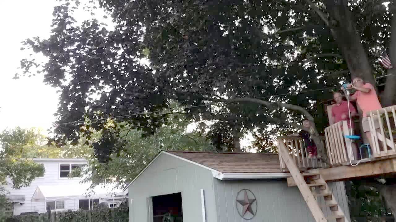A man falls off a zipline in the backyard when it stops suddenly as he reaches the end of the line.